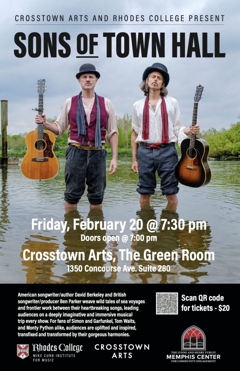 Crosstown Arts, The Green Room 1350 Concourse Ave., Suite 280, Memphis, TN, United StatesCrosstown Arts and Rhodes College Present: Sons of Town Hall The Green Room at Crosstown Arts Friday, February 20th, 2026 Doors open at 7:00 pm | Show Starts at 7:30 pm $20 in advance (plus fees) | $25 at the door Crosstown Arts, Rhodes College, and the Turley Memphis Center for Community Engagement present the […]