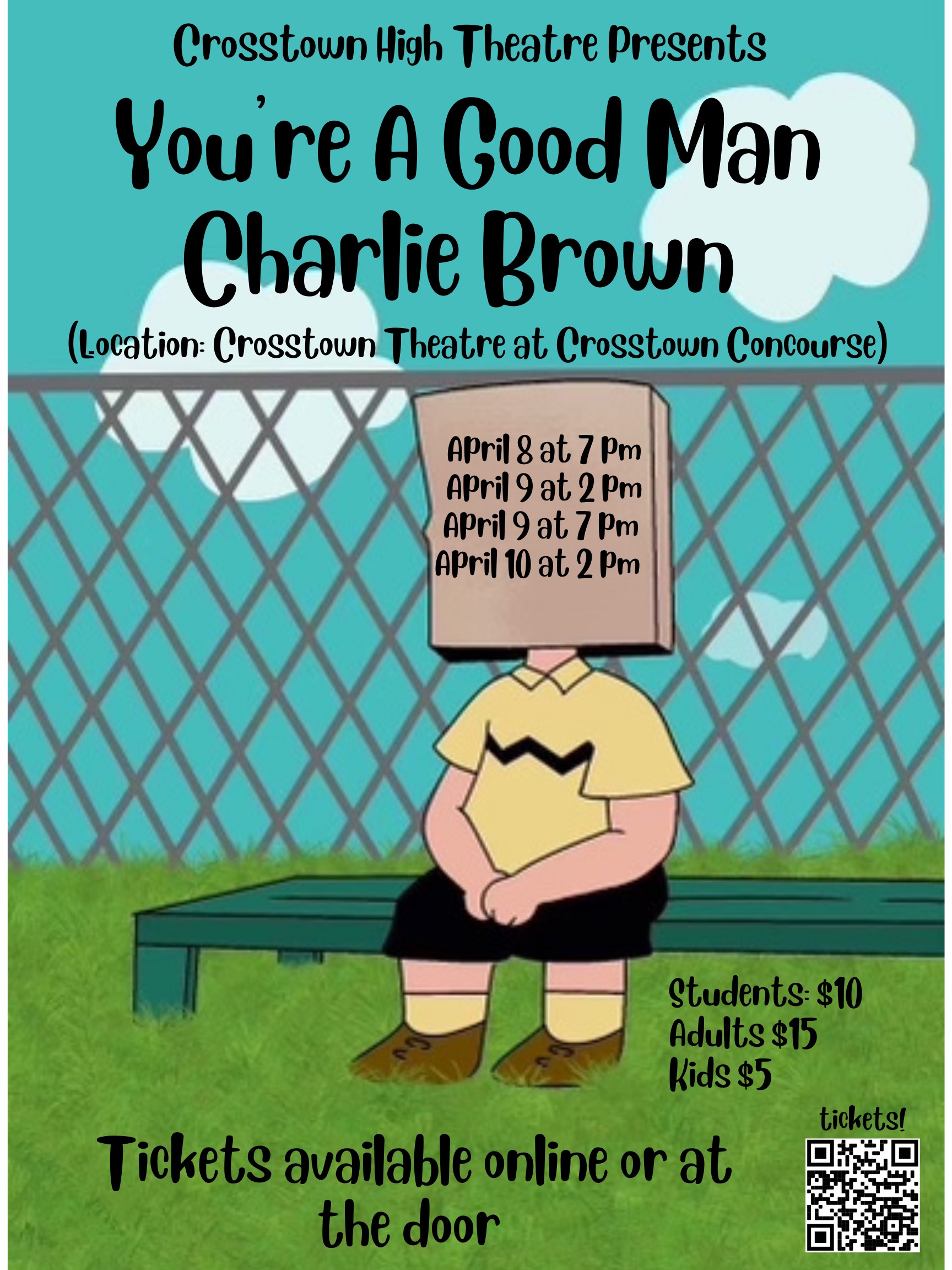Crosstown High Theatre is proud to present their rendition of You’re a Good Man Charlie Brown by Clark Gesner. They will be performing at the Crosstown Theater located directly behind the main atrium and next to Farm Burger. Bring out the whole family, your friends, and your friends’ kids to this heartwarming and funny musical! House will open 45 minutes before showtime and concessions will be available. Tickets will be available online as well as at the door. We hope to see you there!